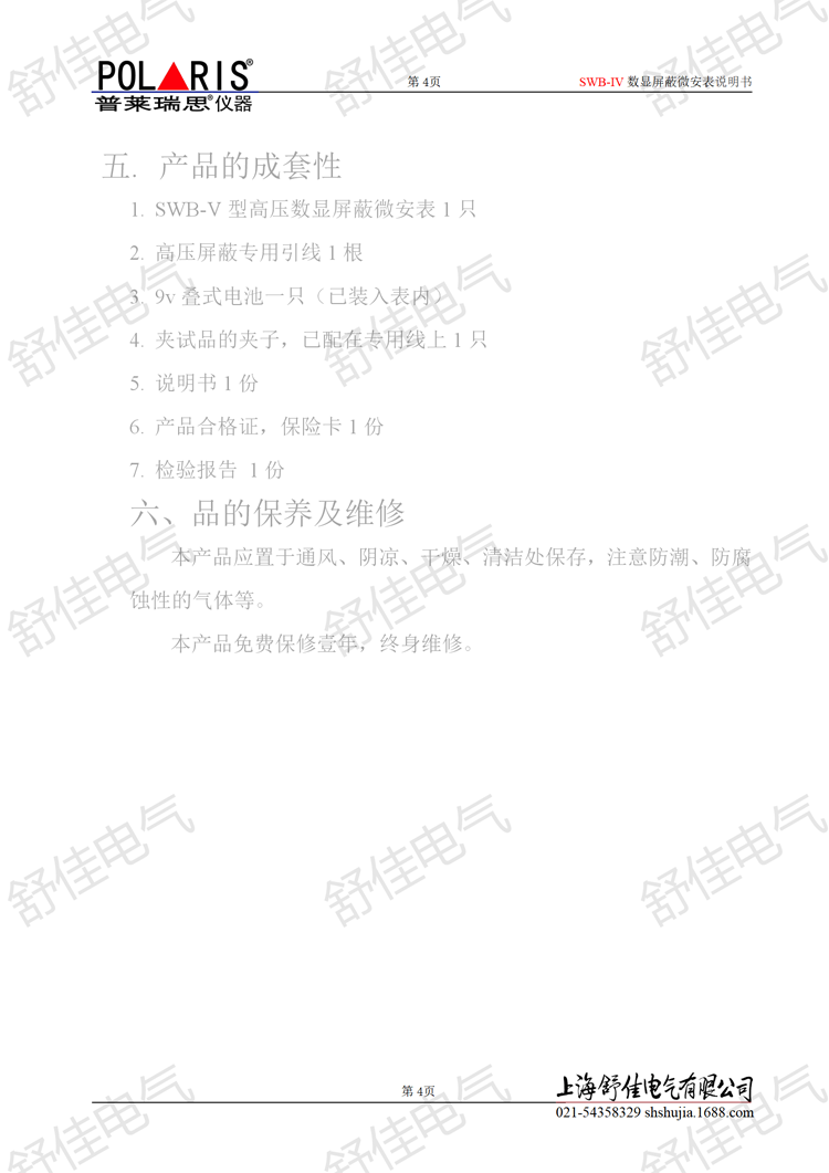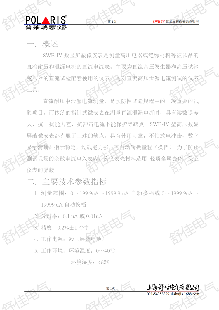 一.概述 SWB-IV數(shù)顯屏蔽微安表是測(cè)量高壓電器或絕緣材料等被試品的直流耐壓和泄漏電流的直流電流表。主要為直流高壓發(fā)生器和高壓試驗(yàn)變壓器的直流試驗(yàn)配套使用的儀表,是對(duì)直流高壓泄漏電流測(cè)試的儀表工具。 直流耐壓中泄漏電流測(cè)量,是預(yù)防性試驗(yàn)規(guī)程中的一項(xiàng)重要的試驗(yàn)項(xiàng)目,而傳統(tǒng)的指針式微安表在測(cè)量直流泄漏電流時(shí),具有讀數(shù)誤差大,抗干擾能力差,抗沖擊電流不能保護(hù)等缺點(diǎn)。SWB-IV型高壓數(shù)顯屏蔽微安表都克服了上述的缺點(diǎn)。具有使用可靠,不怕放電沖擊,數(shù)字顯示清晰,指示穩(wěn)定,過(guò)載能力強(qiáng),可自動(dòng)轉(zhuǎn)換量程(換檔)。為了防止測(cè)試現(xiàn)場(chǎng)的雜散電流竄入表內(nèi),該儀表殼材料選用 輕質(zhì)金屬殼體,保證儀表的屏蔽。 二.主要技術(shù)參數(shù)指標(biāo) 1.測(cè)量范圍:0~199.9uA~1999.9 uA自動(dòng)換檔或0~1999.9uA~19999 uA自動(dòng)換檔 2.分辯率:0.1 uA或0.01uA 3.精度:0.2%±1個(gè)字 4.工作電源:9v(層疊電池) 5.工作環(huán)境:環(huán)境溫度:0~40℃ 環(huán)境濕度:‹85% 6.顯示方法:顯示4½位特制大液晶數(shù)顯表(窗口裝導(dǎo)電玻璃)。 7.全屏蔽:表殼為Ø130㎜×60㎜呈橢圓型,材料選用輕金屬經(jīng)表面處理,顯示窗口用導(dǎo)電玻璃,并用殼體相連,使測(cè)量系統(tǒng)真正完全屏蔽。